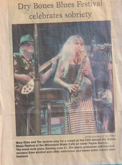 Photograph of two musicians performing at the Dry Bones Blues Festival, with a headline about the festival celebrating sobriety.