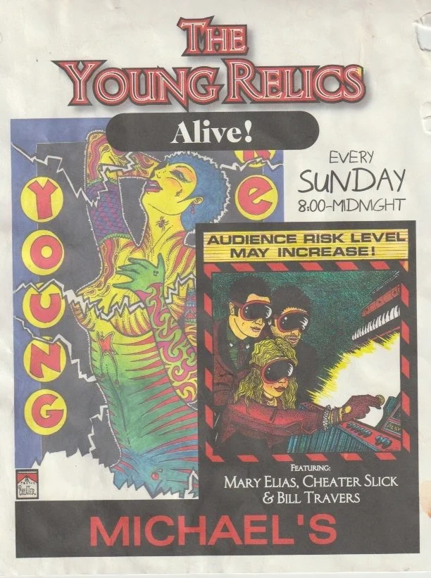 Poster for a music event featuring The Young Relics, every Sunday from 8:00 PM to midnight at Michael's, with performance artists Mary Elias, Cheater Slick, and Bill Travers, warning about increased audience risk level.