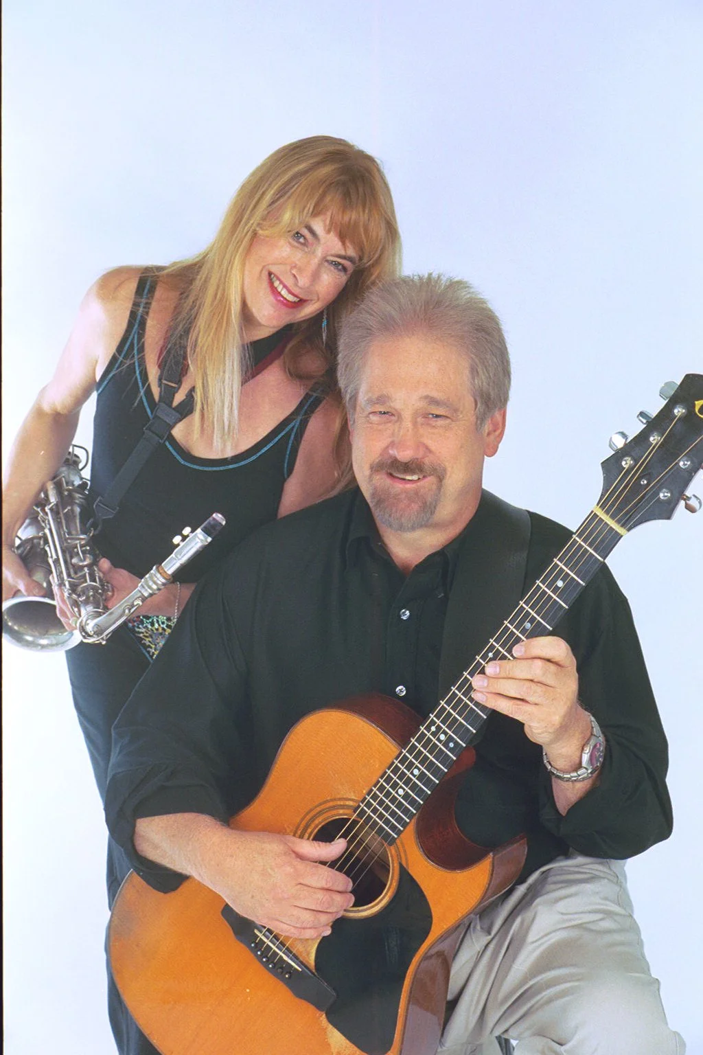 A woman holding a saxophone standing behind a man playing an acoustic guitar, both smiling against a plain white background.