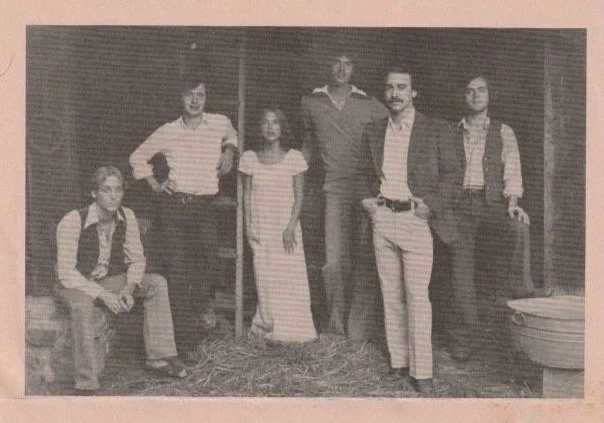 Black and white photo of six young adults outdoors, some standing and some kneeling, during a festival with Don Strand, with trees and a small building in the background.