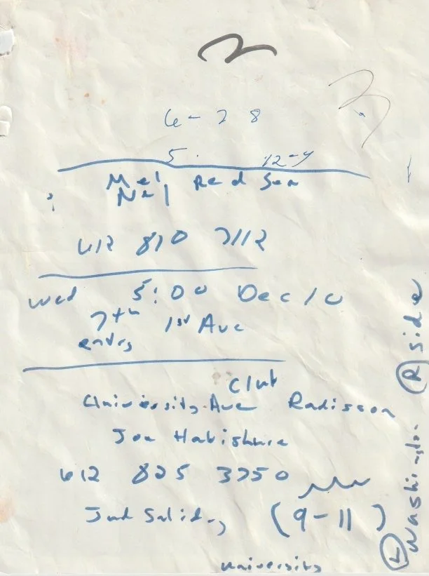 Handwritten notes with addresses, dates, and phone numbers on crumpled paper