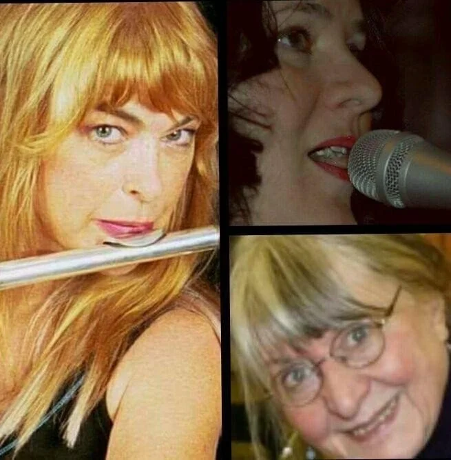Compilation of three women with different hairstyles and glasses, each shown in separate images. The top left woman has long blonde hair and is holding a flute, the top right woman is singing into a microphone with curly hair, and the bottom woman has short blonde hair, glasses, and is smiling.