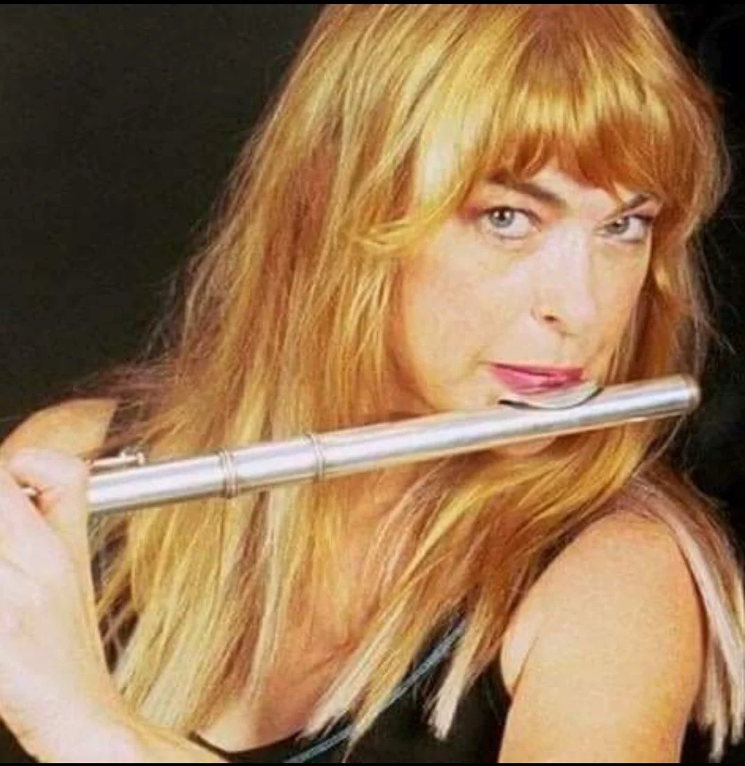A woman with long red hair holding a silver flute near her face, looking to the side.