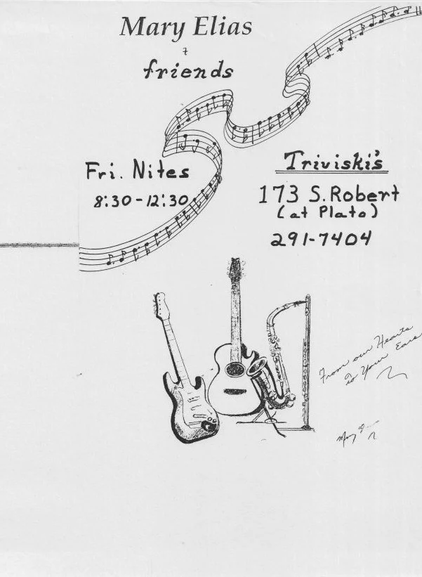 Handwritten flyer for a music gathering featuring guitars and a saxophone, with details about a Friday night event from 8:30 to 12:30 at 173 S. Robert. The flyer bears the title 'Mary Elias friends' and has musical notes and a musical staff. There is also a handwritten note that says, 'From our hands of your ears.'