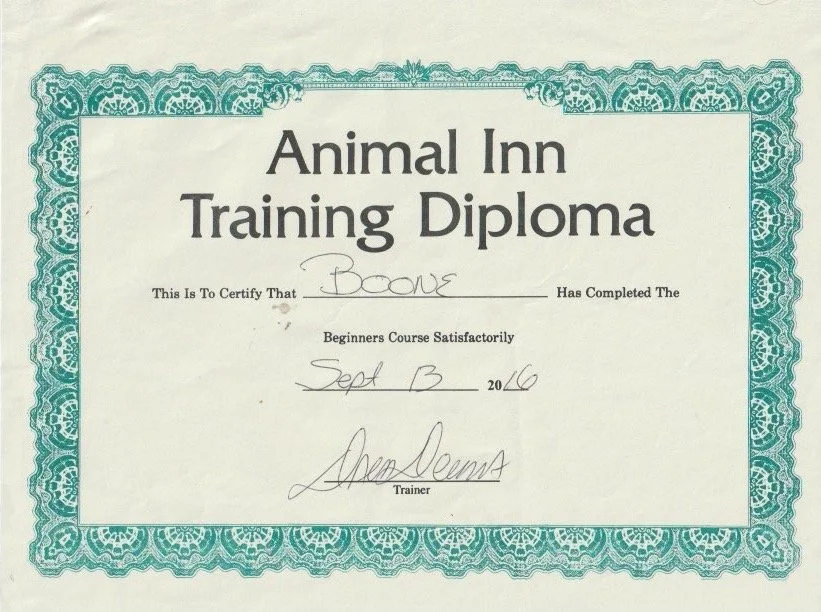 Animal Inn Training Diploma awarded to Boone for completing a beginner's course with a date of September 13, 2016, signed by the trainer.